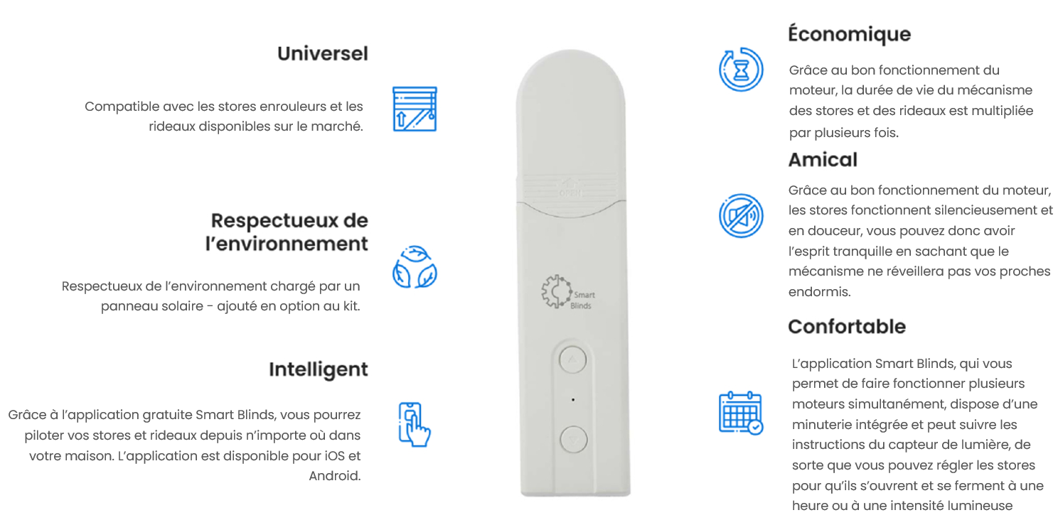 RolloStore, la façon intelligente d’automatiser les stores.Les moteur intelligents sont le complément parfait à n’importe quelle maison. Il est facile à installer et fonctionne avec n’importe quel stores et rideaux ou autre couvre-fenêtre. Le moteur est petit et s’intègre facilement dans n’importe quel intérieur. Il est compatible avec tous les smartphones et peut être contrôlé via l’application. Contrôle de l’appareil via l’applicationL’application de contrôle du moteur est téléchargeable gratuitement et se connecte à l’appareil via la technologie Bluetooth 4.2. À l’aide de l’application, vous pouvez vérifier la position du store et le niveau de charge de la batterie. Vous pouvez également régler plusieurs minuteries pour chaque volet roulant, afin de pouvoir les régler pour qu’ils s’ouvrent et se ferment à des moments différents. Application Smart Blinds – le moyen le plus pratique de contrôler les stores. Contrôle de plusieurs stores avec une seule application Fonction d’automatisation - commande de groupes de stores Possibilité de définir un horaire pour chaque store |